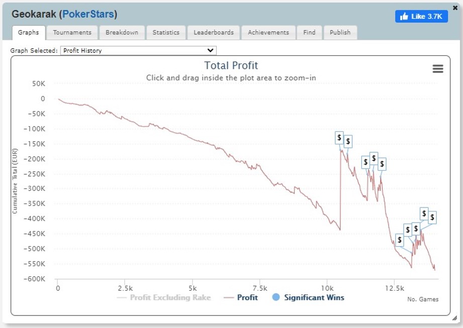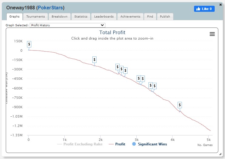 Ook zijn er op sharkscope genoeg voorbeelden van grafieken die de verkeerde kant op gaan. De oorzaak hiervan is vaak dat spelers hogere buy-ins spelen dan ze qua niveau aankunnen, of omdat de buy-ins een te groot gedeelte van hun bankroll zijn waardoor ze de variantie niet op kunnen vangen. Daarom is het altijd belangrijk om je resultaten bij te houden en te zorgen dat je niet te hoog speelt. Het is echt geen schande om toernooien te spelen met een lagere buy-in. Op deze manier kun je rustig ervaring opdoen en je bankroll langzaam opbouwen. Poker is tenslotte een marathon, geen sprint.
