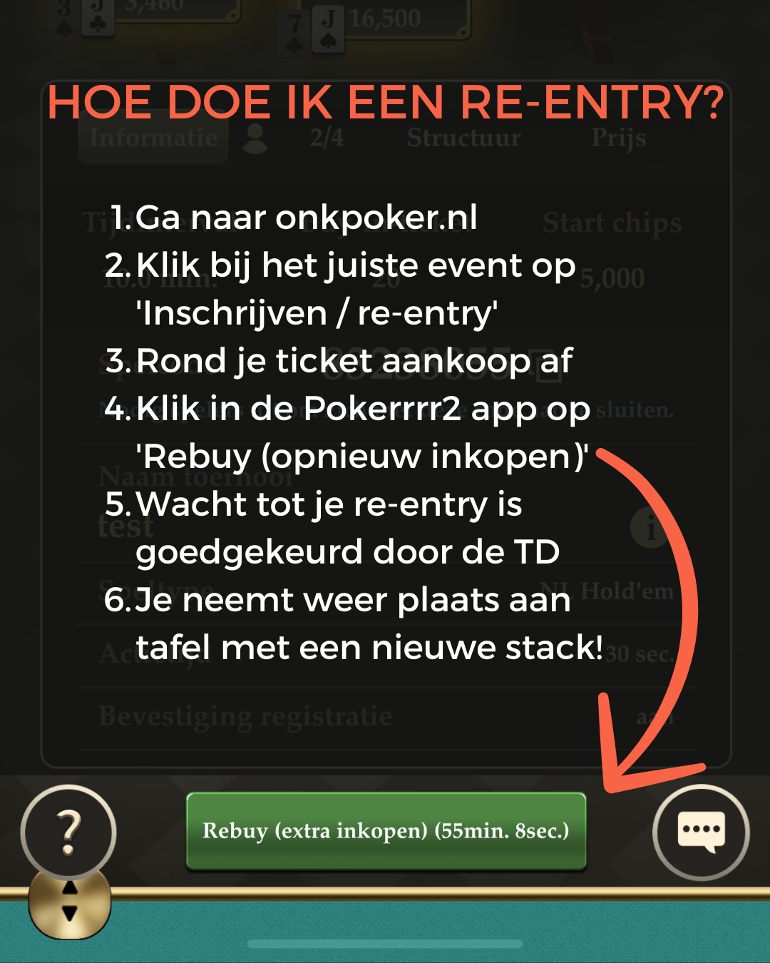 Word je heel snel uitgeschakeld? Tot de tweede pauze kun jij je eenmalig opnieuw inkopen! De re-entry fase loopt gelijk aan de late registratie periode. Je kunt dus tot 20.53 uur een ticket / re-entry kopen. Je hebt dan tot uiterlijk 20.55 uur om je in de Pokerrrr2 app aan te melden.