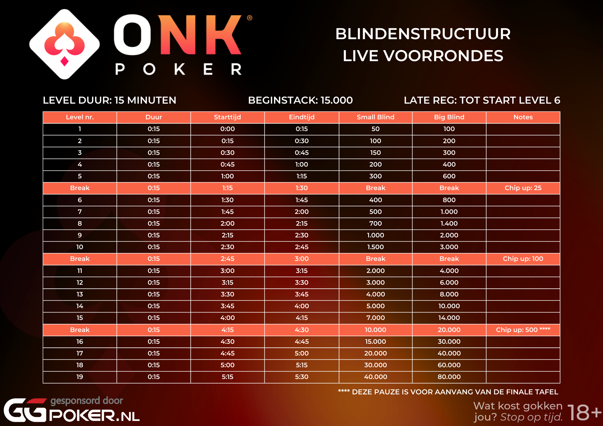 *Omdat de deelnemersaantallen per live voorronde verschillen, kan de toernooidirecteur gebruik maken van 2 verschillende blindstructuren. Over het algemeen zal de TD t/m 60 online inschrijvingen gebruik maken van structuur 1 en bij 61+ online inschrijvingen van structuur 2.
