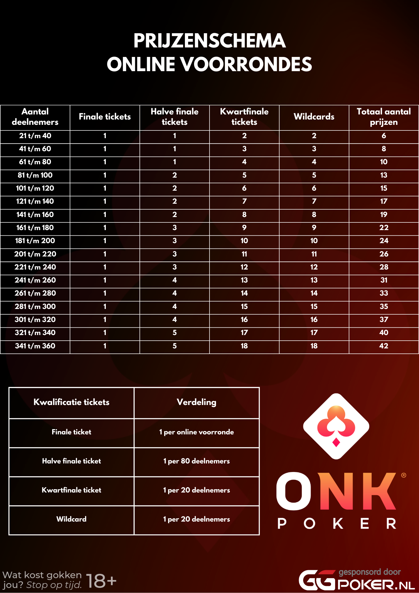 Bij een gemiddelde online voorronde (130 deelnemers) valt zo'n 11% van het deelnemersveld in de prijzen. Dat betekent in dat geval 14 spelers in de prijzen (#1 - Finale ticket, #2-#4 - Halve finale ticket, #5-#9 - Online kwartfinale ticket, #10-#14 - Wildcard).