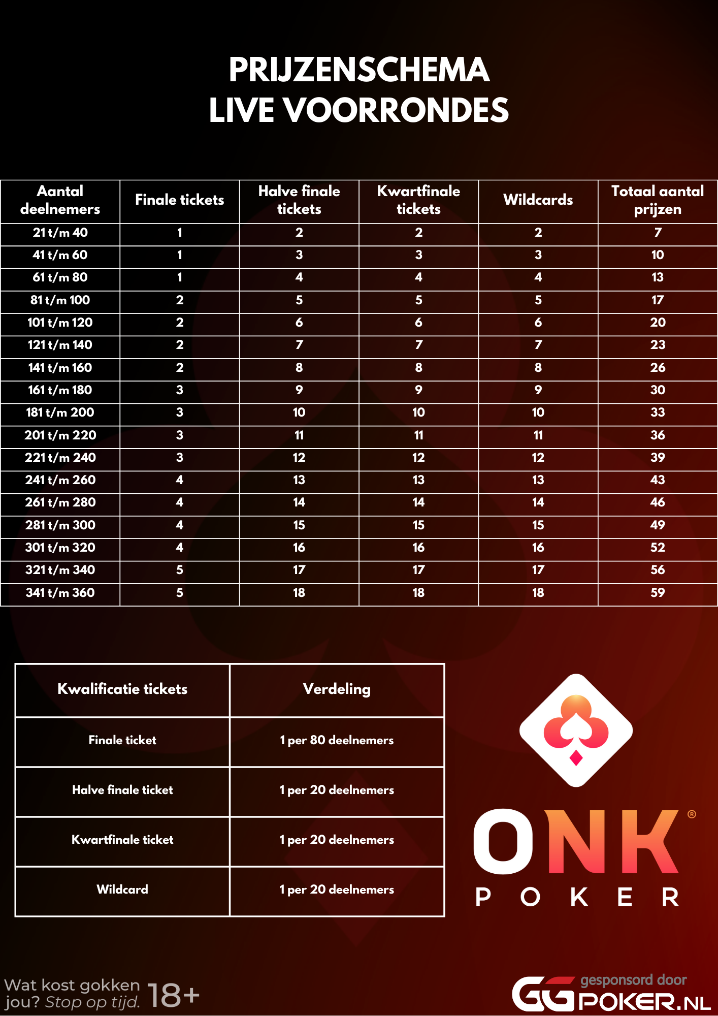 Het ONK Poker bestaat dit seizoen uit circa 175 live voorrondes verspreid door heel Nederland en bijna iedere dag een online voorronde die gespeeld wordt op de gratis mobiele app Pokerrrr 2. Via deze voorrondes kun jij je kwalificeren voor de kwartfinales, halve finales en de landelijke finale. Bij het ONK Poker speel je mee voor de spanning, competitie en gezelligheid. Je kunt geen prijzengeld winnen, maar wel de nieuwe Pokerkampioen van Nederland worden!