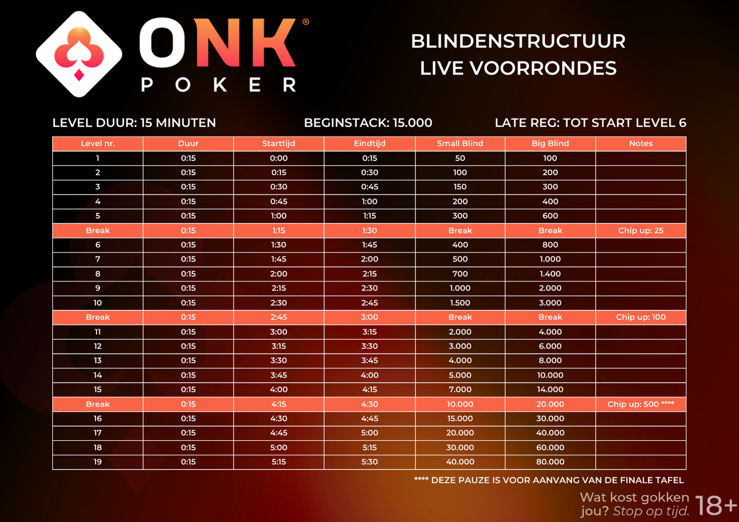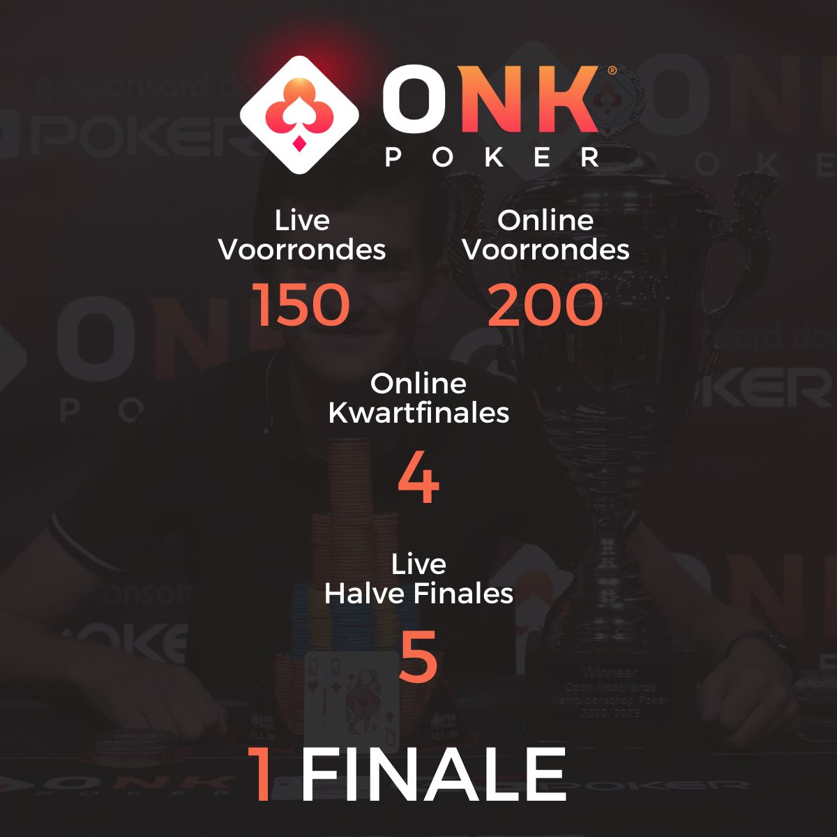 Het ONK Poker bestaat dit seizoen uit 150 live voorrondes verspreid door heel Nederland en 200 online voorrondes die gespeeld worden op de gratis mobiele app Pokerrrr 2. Via deze voorrondes kun jij je kwalificeren voor de kwartfinales, halve finales en de landelijke finale. Bij het ONK Poker speel je mee voor de spanning, competitie en gezelligheid. Je kunt geen prijzengeld winnen, maar wel de nieuwe Pokerkampioen van Nederland worden!
