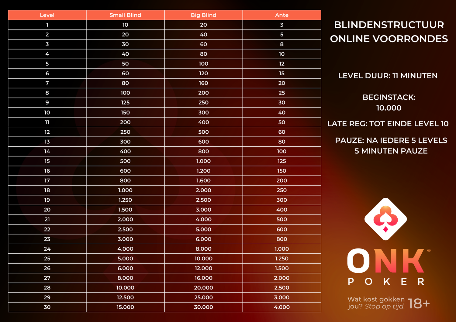 Het ONK Poker maakt gebruik van verschillende blindstructuren. De blindstructuur wordt bepaald aan de hand van het aantal spelers dat meedoet aan de voorronde en of deze live of online plaatsvindt. Je kunt de verschillende blindenstructuren hieronder bekijken. De blindstructuren voor de Kwart Finales, Halve Finales en Finale worden op een later moment bekend gemaakt.