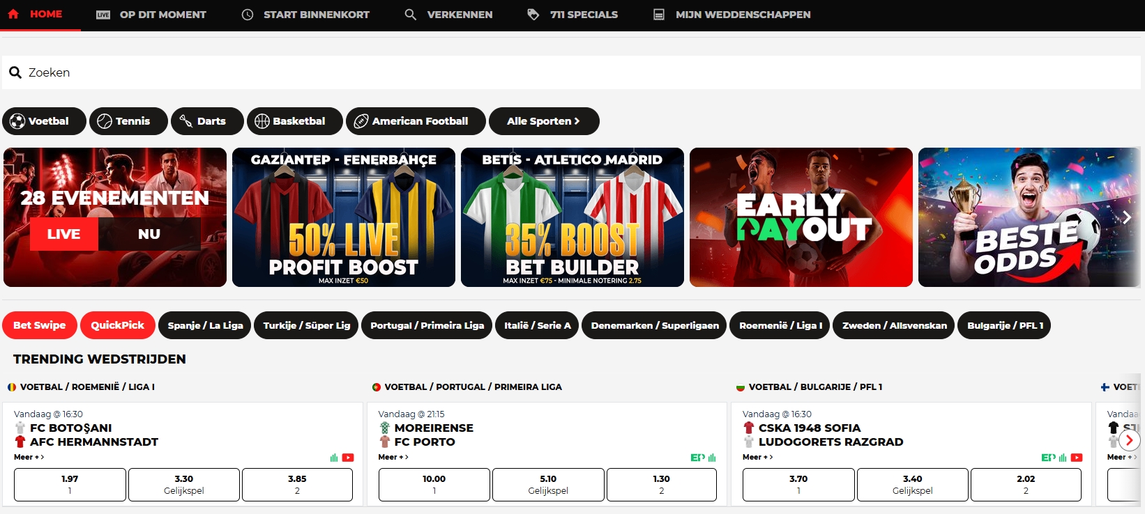 Bij 711 kun je niet alleen terecht voor casino en live casino, maar ook voor sportweddenschappen. Onder de naam 711 Sport biedt het platform een gebruiksvriendelijk sportsbook waar je zowel pre-match als live kunt wedden op talloze sporten wereldwijd.