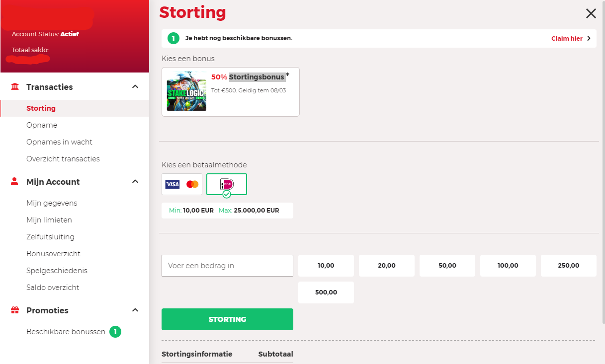 Het opnemen van geld gaat via Bank Transfer. Hierdoor wordt het geld binnen 5 minuten overgemaakt op je rekening. In het overzicht aan de linker kant, zoals de onderstaande afbeelding weergeeft, kun je ook gemakkelijk je account gegevens inzien. Je kan via hier je limieten beheren, spelgeschiedenis bekijken en ook je huidige bonusoverzicht zien. Door dit op één plek te hebben is het allemaal erg overzichtelijk.