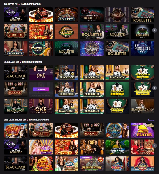 Naast de populairste slots van dit moment is er ruime keuze tussen verschillende blackjack en roulette tafels. Ook de meest populaire game shows van dit moment zijn te vinden op de website van Hard Rock Casino, zoals Monopoly Live, Funky Time en Sweet Bonanza Candyland.