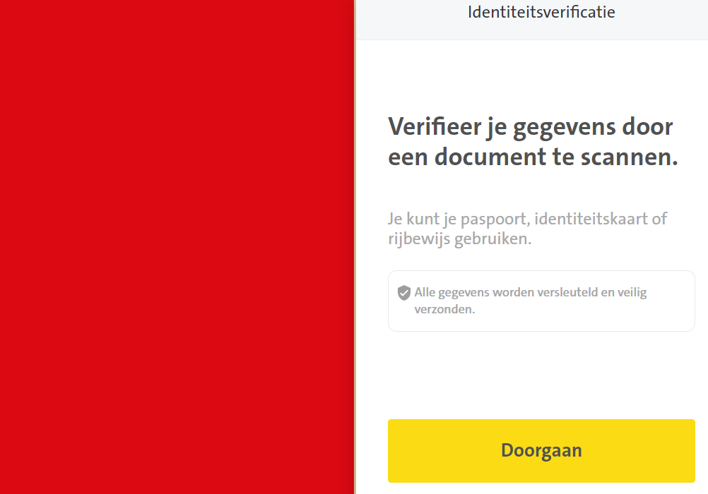 Zoals je op de afbeelding hierboven ziet kun je een account maken door op de button "registreren" te drukken. Je komt dan terecht in je eerste stap (1/3) van het registratieproces. In deze stap moet je je e-mailadres opgeven en daarbij een wachtwoord invullen. Nadat je dit ingevuld hebt en op de button "doorgaan" hebt geklikt, krijg je een melding op je beeldscherm waar je jouw paspoort, identiteitsbewijs of rijbewijs moet scannen.
