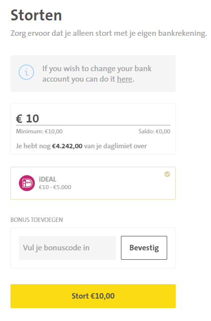 We zijn nu bij het moment aangekomen dat we geld gaan storten op Jack's.nl. Dit ging bij mij moeiteloos, net zoals het registreren bij de online aanbieder. Als stortingsmogelijkheden kan je kiezen uit het gebruik van Visa Card of Ideal. Dit is wat mij betreft voldoende, aangezien de meeste mensen gewoon gebruik kunnen maken van Ideal. Het minimale bedrag wat je kunt storten is €10,00. Zoals eerder gezegd verliep de verificatie van mijn account en bankrekening moeiteloos, en dat geldt ook voor mijn eerste storting op Jack's.nl Na het gekozen bedrag te hebben gestort ontving ik gelijk mijn saldo waardoor ik gelijk kon spelen op de site.