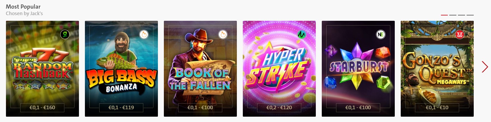 Het eerste spel wat ik gespeeld heb was Big Bass Bonanza. Daarna Starbust en Gonzo's Quest. Wat ik fijn vind aan de spellen op Jacks is dat ze schermvullend zijn en alles goed te zien is. Op sommige sites speel je het spel in een klein kader wat naar mijn inzicht een minder leuke speelervaring heeft. Ik heb niet gewonnen maar wel plezier gehad, en dat is het belangrijkste.