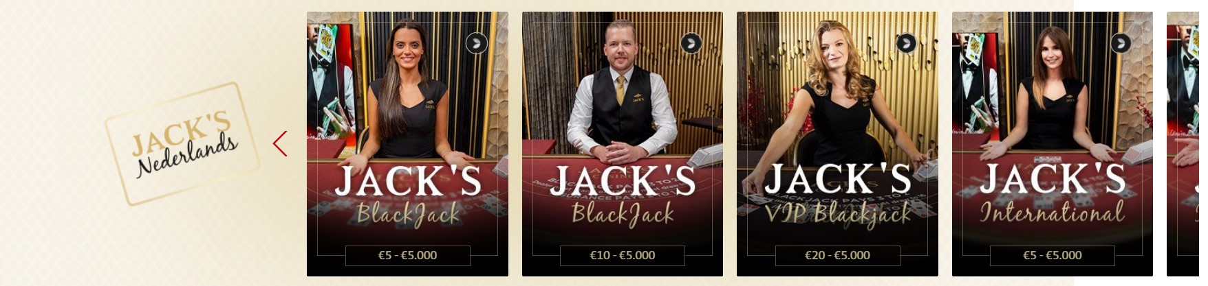 Ook het Live Casino van Jack's Casino is goed gevuld met spellen. Naast de te verwachten spellen bieden ze ook populaire spellen van dit moment aan, zoals Monopoly Live en Crazy Time. Het leuke van de live casino games van Jack's Casino is dat er Nederlandstalige croupiers achter de blackjack- en roulettetafels staan. Dit leidt tot veel meer interactie met de spelers. Bij andere aanbieders worden vaak buitenlandse croupiers ingezet, wat voor Nederlandse spelers tot minder interactie leidt.