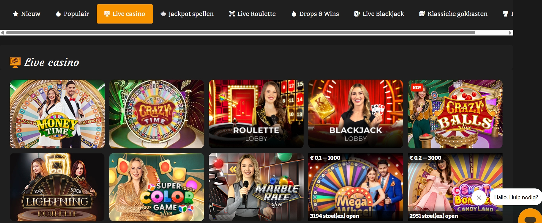 Het live casino wordt geleverd door Evolution, Pragmatic Play en Ezugi. Je vindt er Roulette, Blackjack, Baccarat en populaire game shows (zoals Crazy Time en Monopoly Big Baller). De lobby is snel te filteren op provider of speellimiet. Nieuw? Lees eerst live roulette en blackjack.