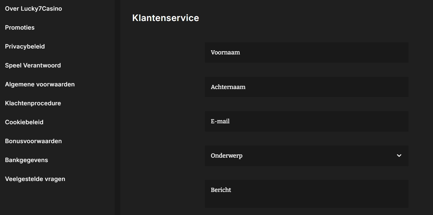 Live chat: via de supportpagina · E-mail: support@lucky7casino.nl · Telefoon: +31 970 1020 4505