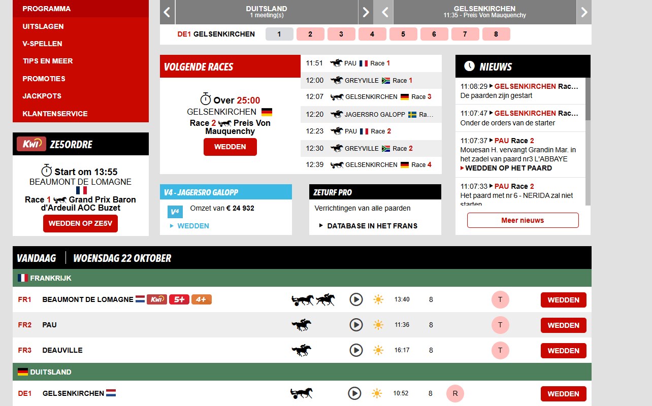 Hieronder vind je de hoofdpagina van ZEturf. Je ziet dat ze meteen paardenraces aanbieden en alle actuele races naar voren laten komen. Dit vind ik goed van de online aanbieder aangezien ze je meteen een beeld geven van de races. Boven in het scherm heb je de mogelijkheid om te switchen van land en plaats. Dit is vooral voor de mensen handig die vooraf al weten op welke race ze willen inzetten. Je kunt hierdoor handig navigeren naar de paardenrace naar wie je opzoek bent. Rechts op de hoofdpagina vind je het kopje "nieuws". Hier worden alle actuele nieuwsberichten geplaatst die je helpen om alle actuele veranderingen te weten over verschillende paardenraces.