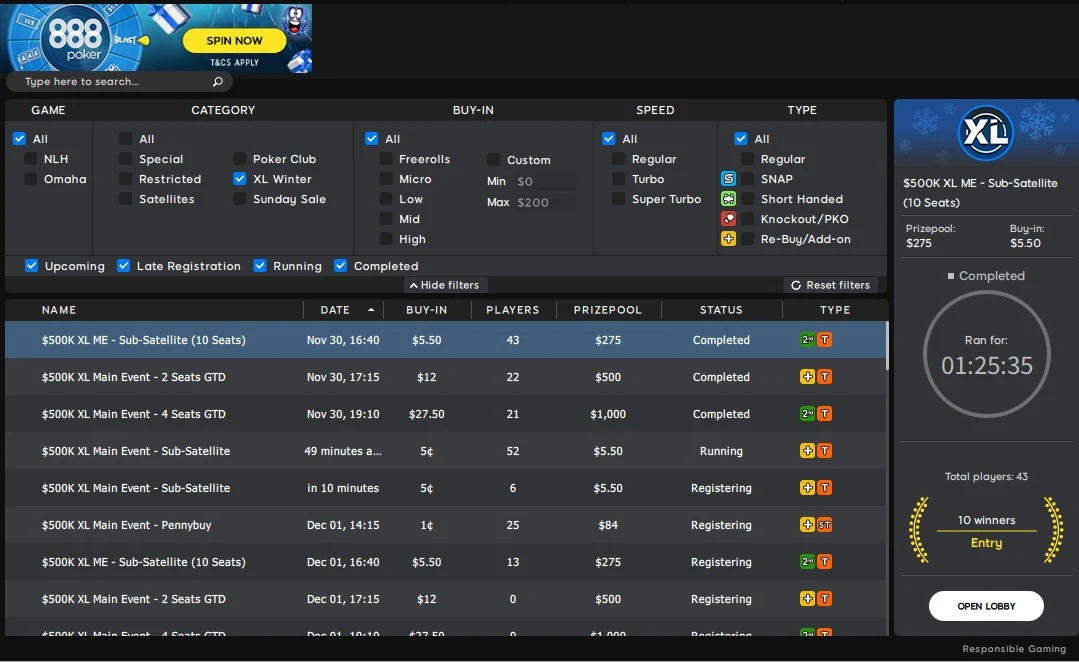 888 Poker heeft 5 verschillende toernooiopties;
