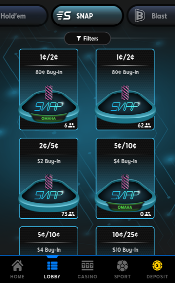 Zelf heb ik dit natuurlijk ook even uitgeprobeerd om een review hierover te kunnen geven. Op de hoofdpagina kon ik makkelijk op de button drukken van Snap waardoor ik meteen naar de startpagina werd gestuurd. Op de startpagina van Snap kon ik kiezen met welke blinds ik wilde spelen. Ik koos voor de blinds van 1c/2c en kon daarna mijn inzet kiezen met hoeveel ik aan de tafel wilde zitten. Dit ging verder allemaal soepel en ik zat binnen 20 seconden aan de pokertafel.