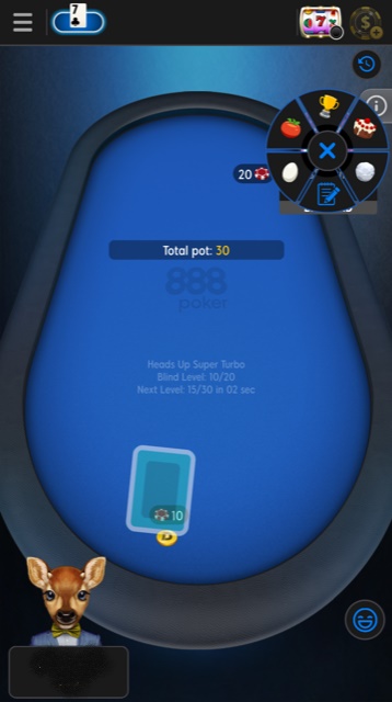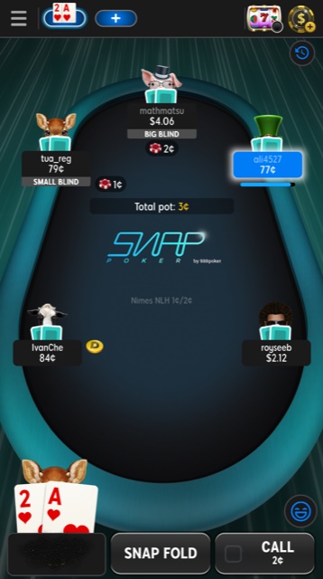 Aan de pokertafel zag ik al snel de button "Snap Fold".Nadat ik een paar keer gebruik had gemaakt van deze button kreeg ik een leuk handje waarmee ik gespeeld heb. Daardoor kwam ik er ook snel achter dat je gebruik kunt maken van animaties. Je kunt bijvoorbeeld dingen naar elkaar toe gooien een gifjes versturen. Verder loopt deze speloptie gewoon enorm snel door omdat je steeds van tafel kunt switchen.