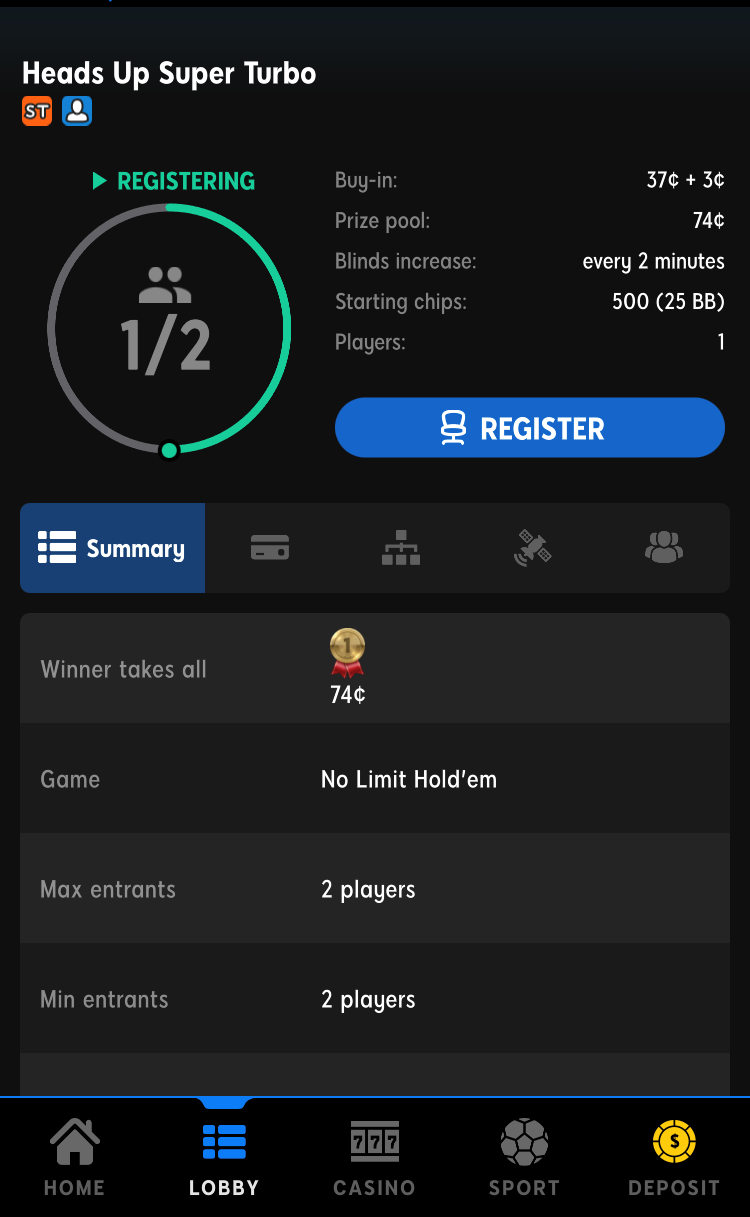 Ook ben ik hier even ingedoken en heb ik een Sit & Go Heads Up Turbo gespeeld. Op de startpagina heb je enorm veel keuze qua verschillende Sit & Go's. Ik heb de eerste aangeklikt omdat de buy-in hiervan 40c is en het daardoor rustig kan reviewen. Wanneer je op jou gekozen Sit & Go drukt, krijg je meer informatie over deze Sit & Go. Op deze pagina kun je je ook registreren en kun je zien hoeveel mensen er al geregistreerd zijn. Bij mij was er één iemand anders geregistreerd en daardoor kon ik meteen aan de tafel gaan zitten.