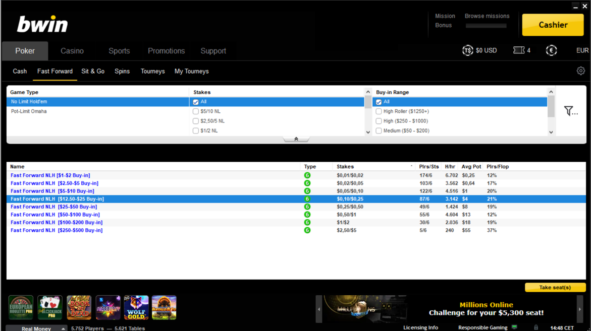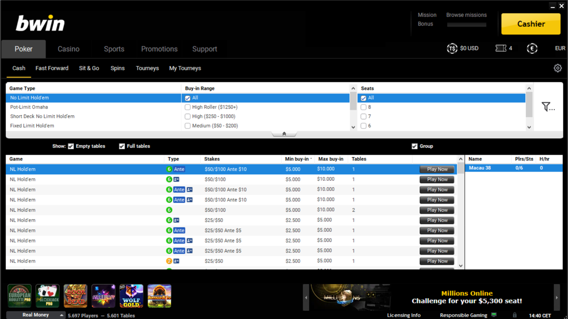 Het cashgame spelaanbod is enorm breed op bwin. Een groot pluspunt in mijn optiek. Niet voor niets spelen duizenden mensen op een dag deze speloptie. Zeker een aanrader om er eens een kijkje te nemen of het eens een keer uit te proberen.