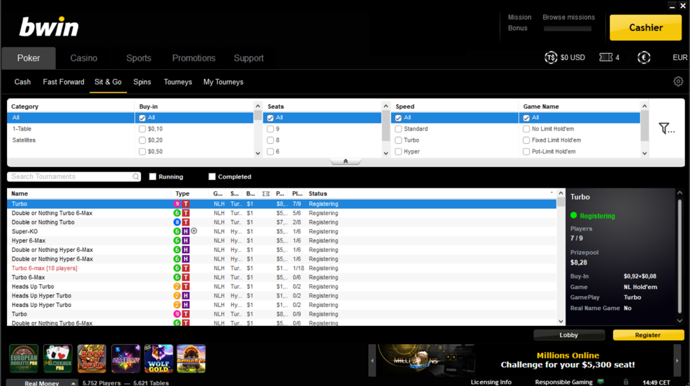 Bwin biedt enorm veel verschillende sit & go’s aan;