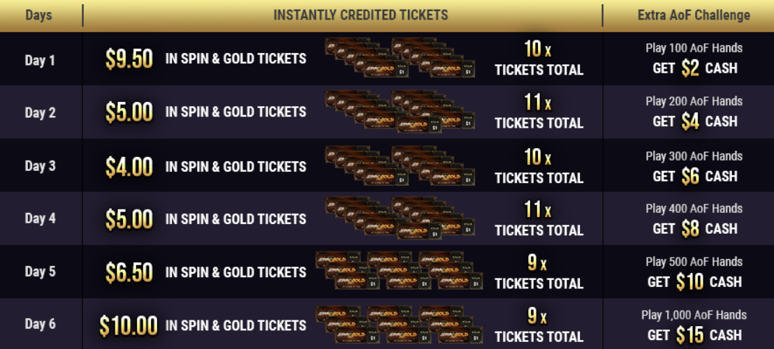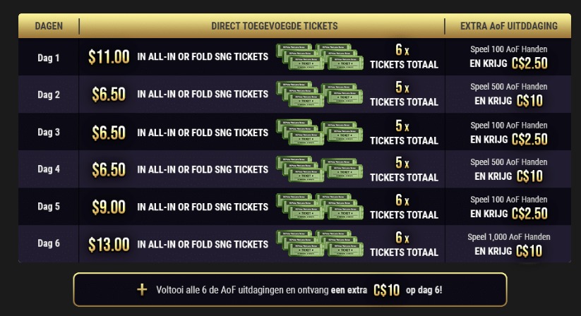 De €50 gratis speeltegoed bonus vond ik wat onoverzichtelijker. Het komt er eigenlijk op neer dat je in de eerste 6 dagen na je eerste storting allemaal ALL-In Or Fold tickets krijgt (zie foto hieronder). Dat vertegenwoordigt een waarde van $50,-. Daarnaast heb je elke dag een extra uitdaging waar je bonusgeld voor kunt krijgen. De eerste dag zijn dat 100 handen all in or or fold en dit loopt op tot 1.000 handen op de zesde dag. Als je elke dag je doel haalt krijg je in totaal €50 aan bonusgeld extra, waardoor de totale bonuswaarde op €100 komt. Ook bij deze bonus ben ik even gaan kijken welke kleine lettertjes er nog aan toegevoegd zijn (onder foto)
