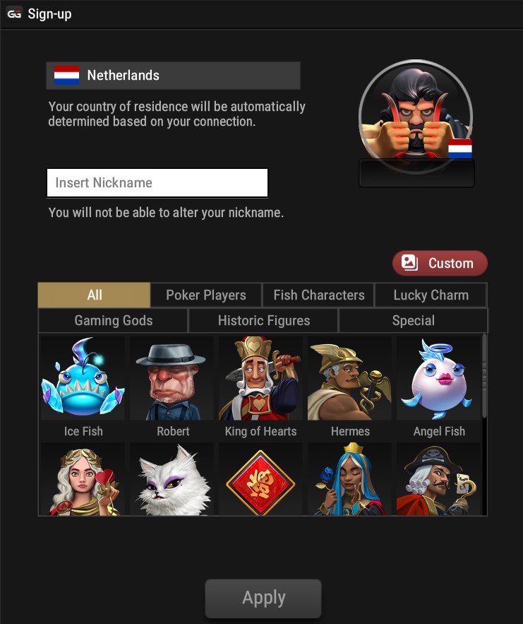 Na deze details verder ingevuld te hebben keerde ik weer terug naar GGPoker en kon ik een nickname en avatar selecteren.