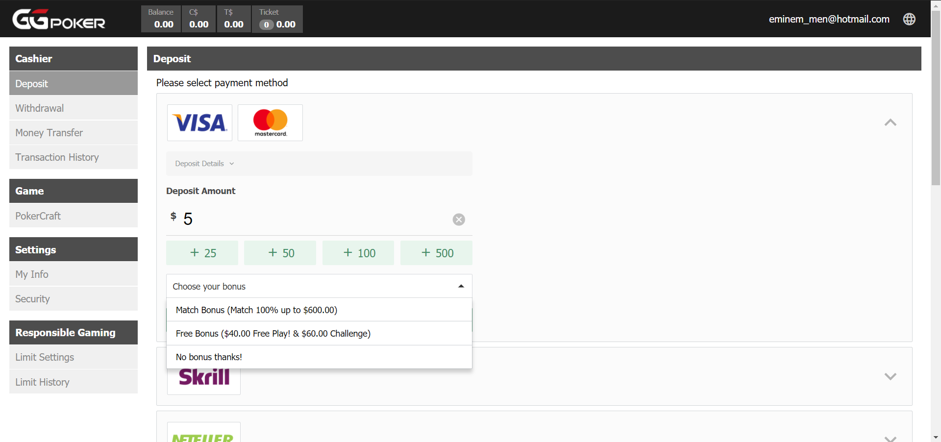 - Voor cashier support kun je mailen naar cashier@ggpoker.com