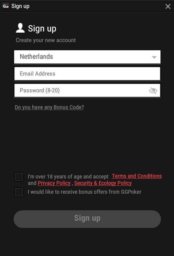 GGpoker kun je eenvoudig downloaden op je desktop, tablet of telefoon. Op de computer bezoek je de GGPoker website en download je de software of je zoekt de app op in de appstore. Het registratieproces werkt eigenlijk ook heel simpel. Ik koos er voor om mij te registreren via de software. Vervolgens gaf ik mijn land van herkomst, e-mailadres en wachtwoord op in stap 1. Je kan er eventueel ook voor kiezen om in deze stap een bonuscode in te voeren. Heb je een bonuscode? Dan kun je beter niet vergeten om deze in te voeren. Ik had geen bonuscode, dus ik sloeg deze stap over.