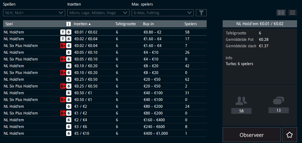 De No limit Holdem cash games worden aangeboden vanaf de limieten van €0,01/€0,02 tot €5/€10. De minimum buy-in is 40 big blinds en het maximum is 100 big blinds. Alle spellen zijn met max 6 spelers. Misschien dat dit nog verhoogd gaat worden als de spelers pool groter wordt. Op de lagere limieten is er voldoende aanbod zodat je vrijwel direct kunt gaan spelen. Bij de hogere limieten kom je meestal nog op een wachtlijst en moet je wat langer wachten op voldoende spelers. Wanneer je er eenmaal inzit, loopt alles wel goed en kun je beginnen met spelen.