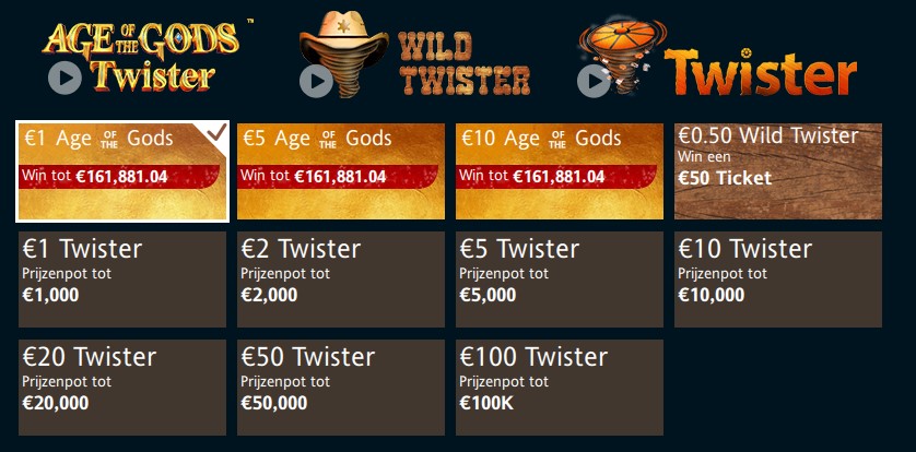 Age of the Gods twister heeft een buy in van €1 tot €10 en de €1 buy in biedt een kans om €2 tot €100 te winnen. Je start echter met maar 100 chips, dus de geluk factor speelt hier wel een grotere rol dan bij de gewone twister. Daarnaast is er een mogelijkheid om een progressieve jackpot te winnen.