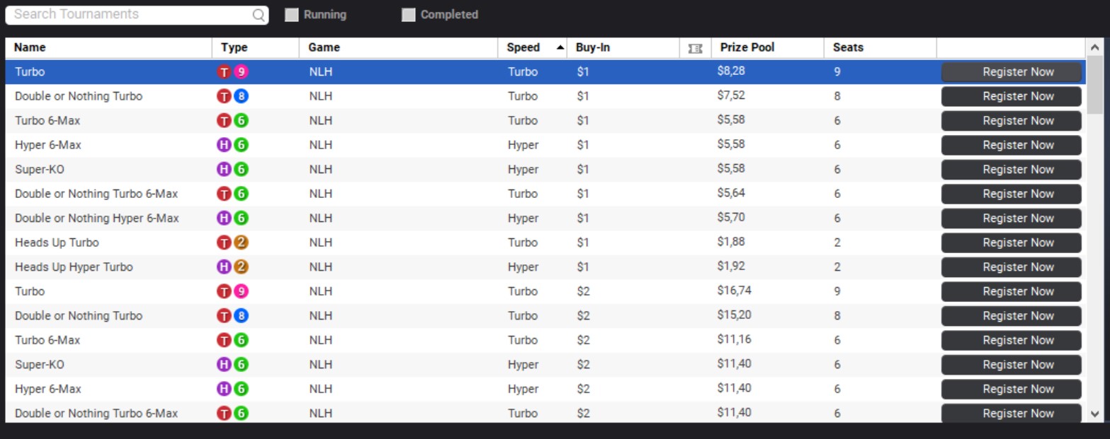 Je kunt de varianten No Limit Hold'em en Pit-Limit Hold'em al spelen met een buy-in van $0,01/$0,02. De maximale buy-in van deze varianten zijn $5.000/$10.000. Je kunt ook tussen deze bedragen inkopen, dat maakt het spelen leuker en zo kun je goed je eigen strategie toepassen tijdens het spelen. De andere twee varianten die worden maar aangeboden op 5 verschillende stakes. Dit komt doordat de animo voor deze varianten een stuk minder is. De maximale buy-in ligt ook een stuk lager, namelijk $1.000/$2.000. De lage buy-ins zijn vooral gemaakt voor de recreatieve pokerspeler. De hogere buy-ins worden vaak gespeeld door mensen met een hogere bankroll en/of professionele pokerspelers.