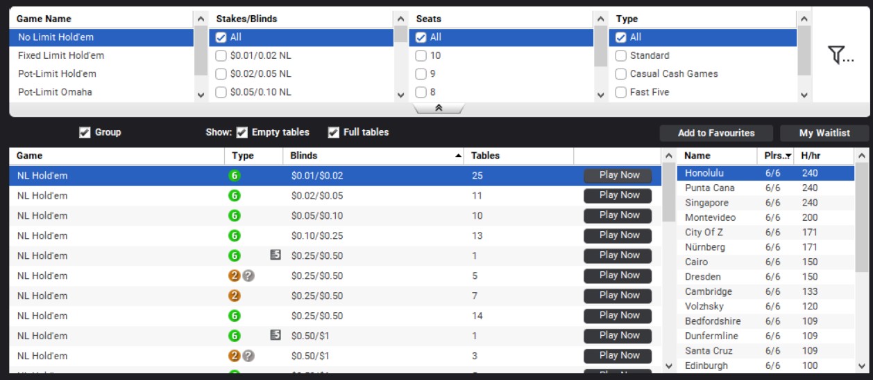 Er zijn verschillende mogelijkheden om te spelen op Partypoker. Je kunt namelijk spelen via de app op je telefoon of tablet, je kunt op Partypoker spelen via de cliënt en tot slot is het ook gewoon te spelen via de browser. Het aanbod bestaat uit 6 verschillende componenten: Cashgames. Fast Forward, Sit & Go, Spins en Toernooien. Als je nog niet helemaal bekend bent met de poker regels raden we aan om deze eerst goed door te nemen voordat je verschillende varianten van poker gaat proberen. De meest populaire variant van poker is Texas Hold 'em, waardoor het spelaanbod van Partypoker logischerwijs ook voornamelijk om deze variant draait.