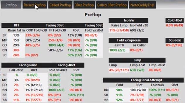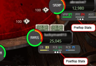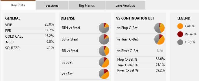 Het paneel - Laat de belangrijkste preflop- en postflop-statistieken zien. Je ziet het percentage 3 bets, fold to 3 bet, fold to c-bet en andere statistieken.