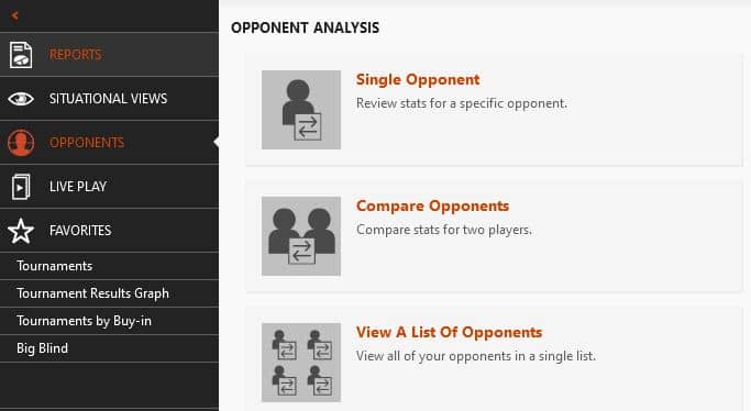 Als je klaar bent met je eigen spel te analyseren kan het handig zijn om het spel van je tegenstanders eens te bekijken. Als je vaak met dezelfde tegenstanders speelt, is het goed om te kijken waar zij fouten maken of wat zij juist goed doen. Zo kan je de volgende keer een betere beslissing maken. Holdem Manager 3 geeft je verschillende mogelijkheden om het spel van je tegenstanders te analyseren. Zoals te zien in de onderstaande afbeelding kan je ervoor kiezen om 1 tegenstander te analyseren, maar je kan ook twee tegenstanders met elkaar vergelijken of een grotere groep. De meest nuttige functie is die van de “single opponent”. Op die manier kan je een tegenstander het beste uitbuiten.
