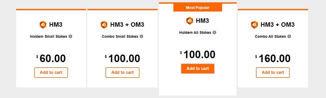 Het prijsverschil tussen de volledige software en die van de small stakes is eenmalig $40,-. Ben je van plan om in de toekomst hogere stakes te spelen, dan raden wij zeker aan om te kiezen voor “all stakes”. Je kan namelijk je hele leven lang gebruik maken van Holdem Manager 3 ook al komt er een nieuwe versie uit. Speel je naast Texas Hold’m ook Omaha, dan kan je er voor kiezen om HM3 + OM3 aan te schaffen. Dit programma valt duurder uit en dan heeft er mee te maken dat er een andere configuratie vereist is voor het gebruik van OM3.