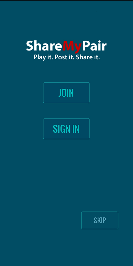 Je kan Share My Pair downloaden in de play store van Andorid en iOS. Als je de app gedownload hebt zie je onderstaand scherm. Het is aan te raden om een account aan te maken, anders kan je zelf geen handen posten. Je kan er voor kiezen om je facebookaccount te gebruiken, maar je kan je ook registreren zonder facebook. Als je een account hebt aangemaakt kan het voorkomen dat je bij het opstarten van de app opnieuw moet inloggen. Je doet dit dus met de gegevens die je zojuist gebruikt hebt om een account aan te maken.