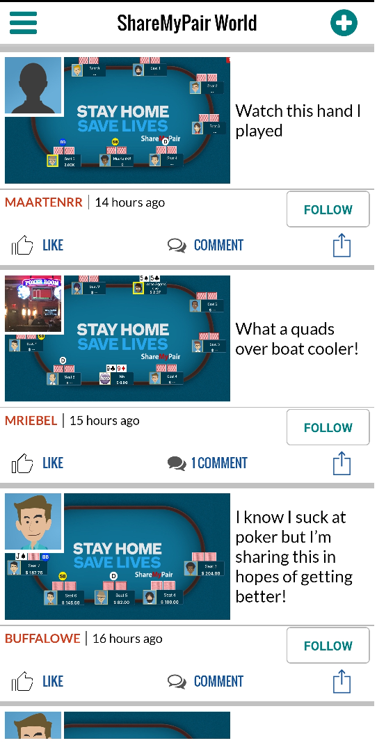 Als je bent ingelogd kom je op Share My Pair World uit. Dat is de startpagina van de poker app. Hier kan je handen zien die net zijn gepost door leden van Share My Pair. Elke dag worden er wel meerdere handen gepost waar jij op kan reageren en dus advies kan geven. Het is daardoor ook een trainingsapp waarbij je jouw visie over een hand kan geven. Om zelf een hand te delen met anderen dien je op het + teken rechtsboven te klikken.
