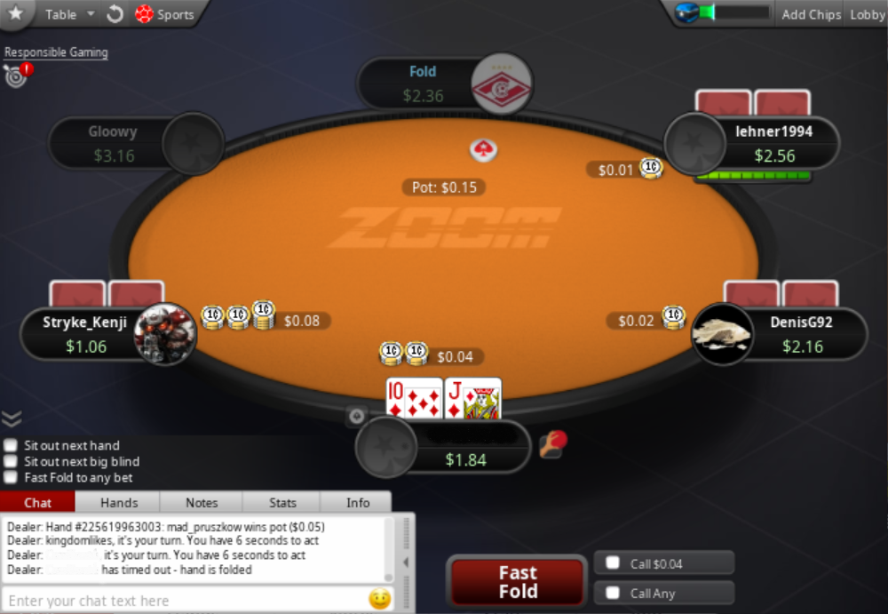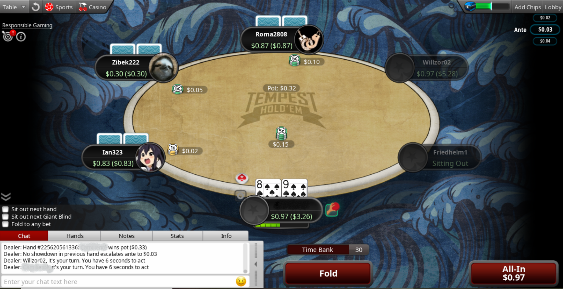 Ik heb mijn keuzes gemaakt en ben toen aan een tafel gaan zitten. Aan de tafel merkte ik al snel dat de software goed en snel werkte. Verder kon ik mijn tafel ook een eigen kleur geven en instellen of ik mijn kaarten wél of niet wil laten zien na een gespeelde hand. Het speelde verder erg vlot en het was zeer duidelijk allemaal. Tijdens het spelen heb je ook nog dingen waarmee je kunt gooien tijdens het spelen. Denk hierbij aan vuurpijltjes, stenen en zakdoekjes. Deze factoren kun je uitschakelen. Ik vond het verder wel grappig en stoor me er niet zo aan.
