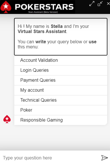 Heb je vragen over Pokerstars of aan Pokerstars? Het bedrijf is op verschillende manieren te bereiken. Er is een uitgebreide help sectie op hun website te vinden. Je kan daar je vraag invoeren en dan kom je vanzelf bij het antwoord op je vraag uit. De Help Sectie is erg uitgebreid. Virtuele Klantenservice Bots worden ook steeds populairder. Van een bedrijf wat zo groot is als Pokerstars kun je verwachten dat zij dit ook hebben en niets is minder waar. De Virtuele Stars Assistent heet Stella en je kan haar een berichtje sturen via hun helpsectie.