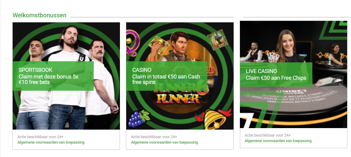 Unibet heeft voor elke categorie een andere welkomstbonus. Er is een bonus welkomstbonus voor het sportsbook. Hierbij krijg je 5 gratis bets van €10. In het casino kan je €50 aan gratis spins claimen of €50 aan gratis chips.