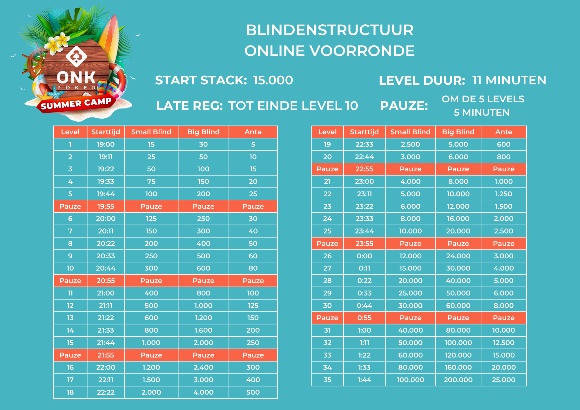 Doe deze zomer mee aan het ONK Poker Summer Camp '25! Hier kun jij jezelf klaarstomen voor het nieuwe ONK Poker seizoen. Bij iedere voorronde kun jij je kwalificeren voor de finale van het Summer Camp. Lees hier alle informatie over het ONK Poker Summer Camp.