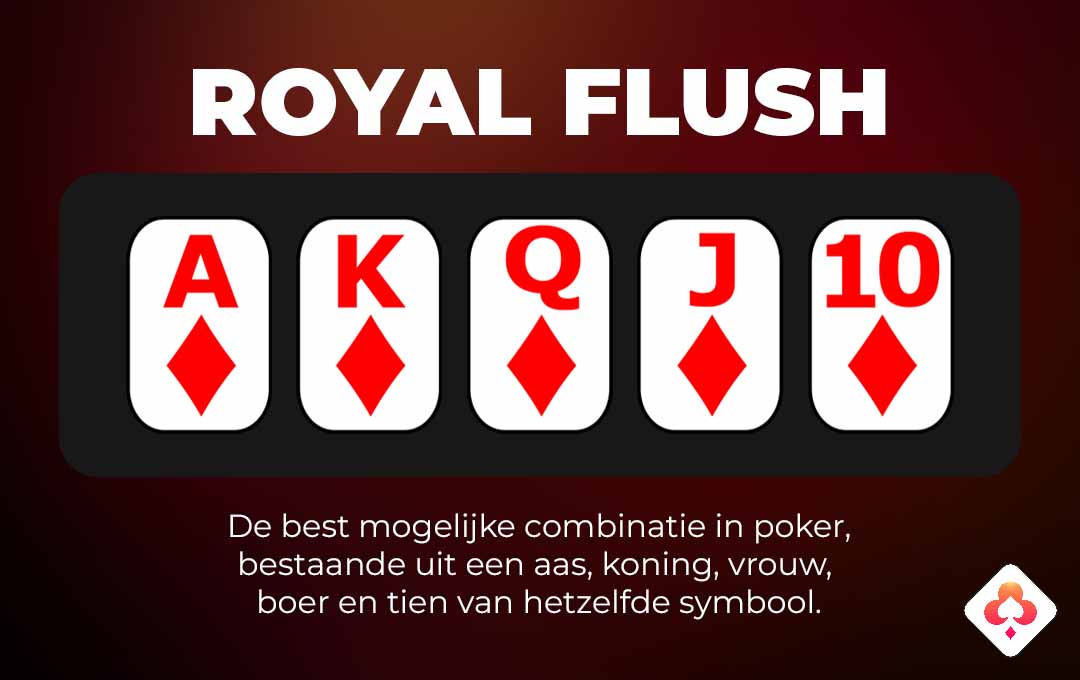 Een Royal Flush is de hoogst haalbare handcombinatie in de meeste varianten van Poker. Een Royal Flush bestaat uit een 10-J-Q-K-A die alle 5 van hetzelfde symbool zijn.