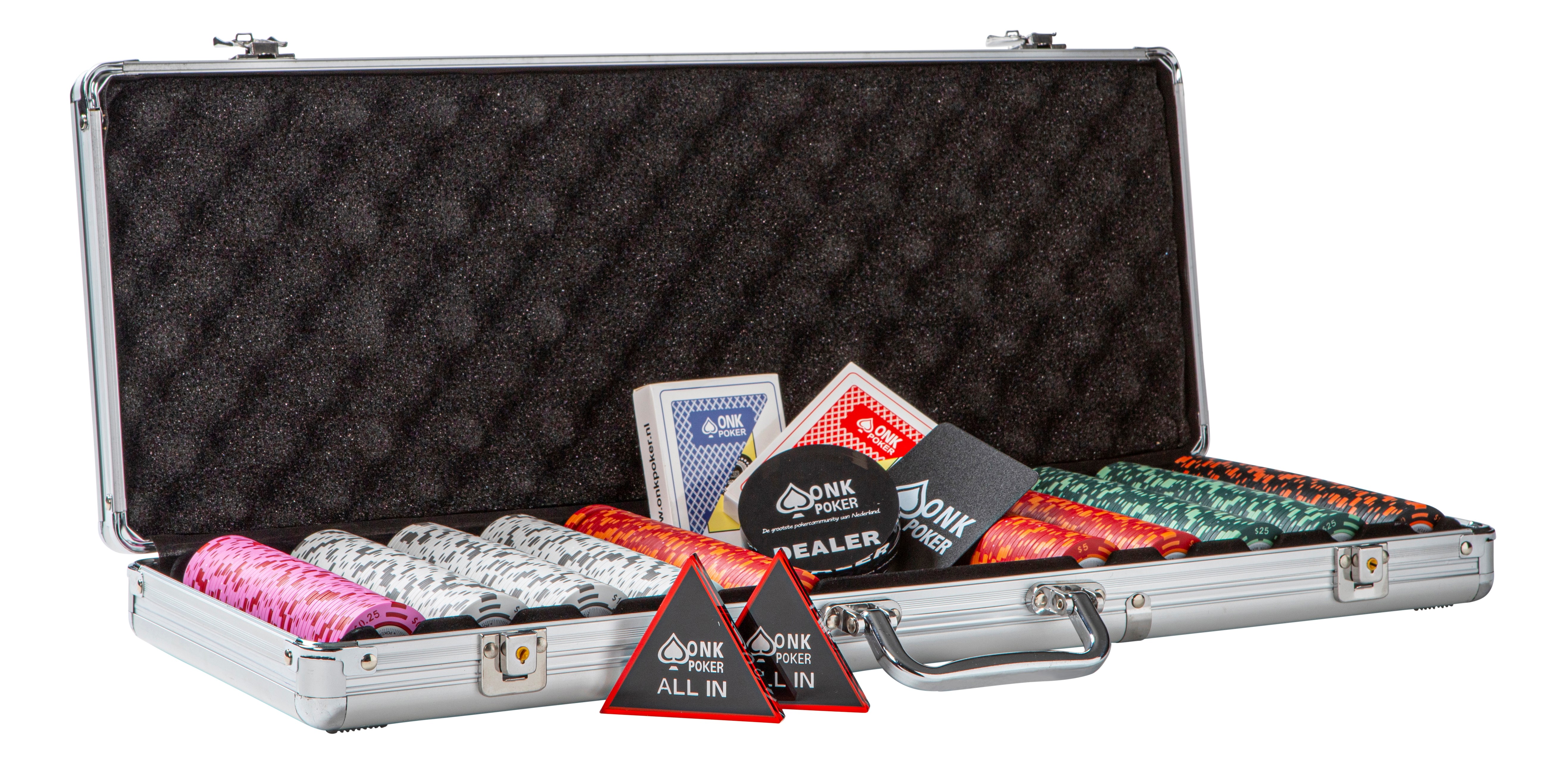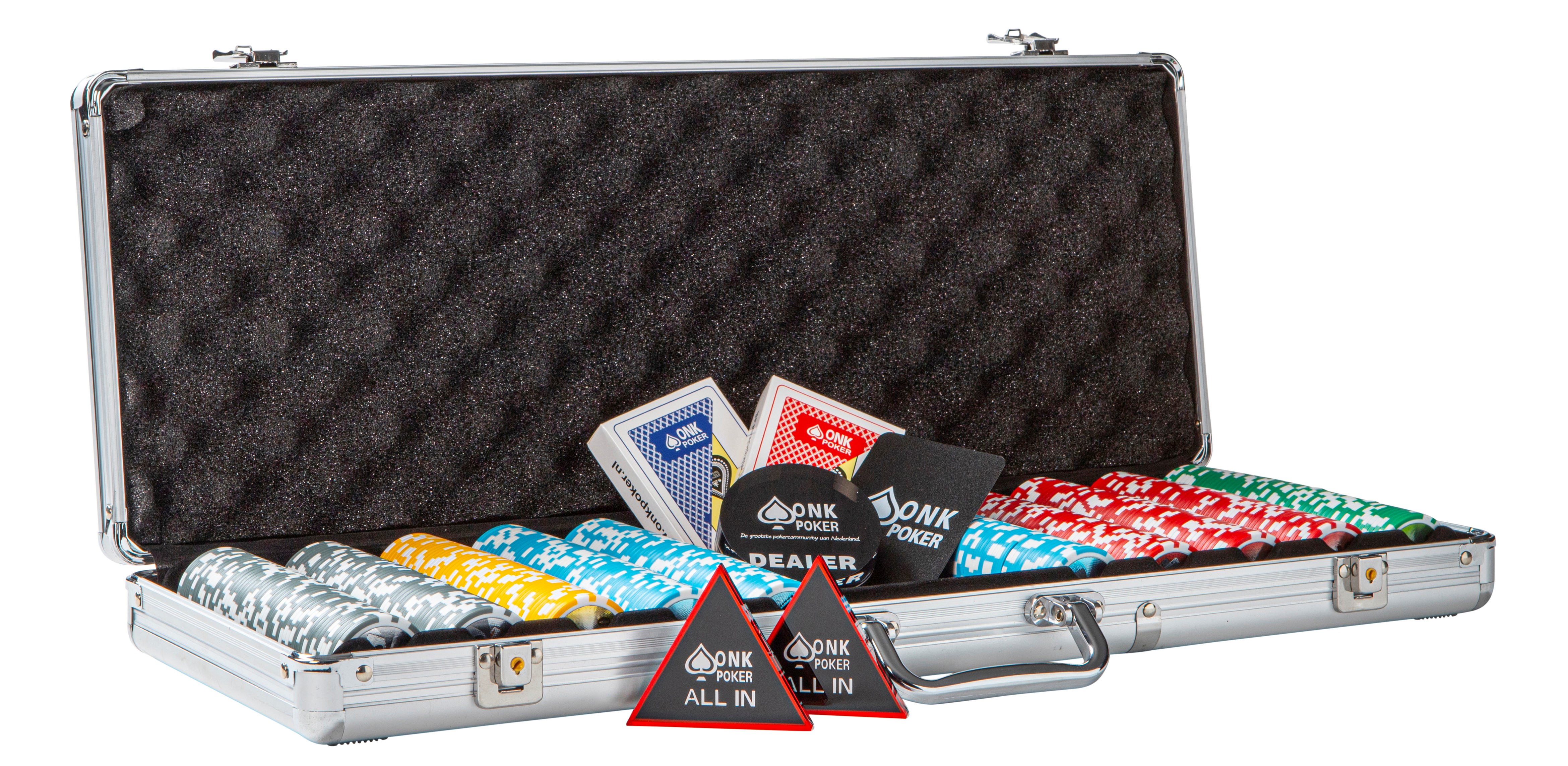 Als je van plan bent om veel sit&go's of toernooien te spelen, raden we aan om voor een toernooi pokerset te gaan. Bij een toernooi pokerset zijn de waarden op de chips over het algemeen hoger dan bij een cashgame pokerset. Bij een toernooi set beginnen de waarde van de chips vaak bij 25 en lopen op tot 100.000, afhankelijk van welke set je koopt. Je kan bij het uitzoeken van een pokerkoffer ook nog kiezen tussen een beginnende set met alleen de chips of een complete set, inclusief 100% plastic kaarten, een dealerbutton, eeen cutcard en all-in buttons.