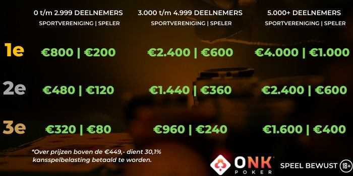 De te winnen prijzen zijn gebaseerd op het totale deelnemersaantal van het Online Pokertoernooi voor de Sport, met een minimale prijzenpot van €2.000 en een maximale prijzenpot van €10.000. Vergeet dus niet om je vrienden en familie op de hoogte te stellen van dit evenement. Hoe meer mensen er mee doen voor jouw sportvereniging, hoe groter de kans dat zij een mooi geldbedrag winnen en hoe groter de totale prijzenpot wordt!