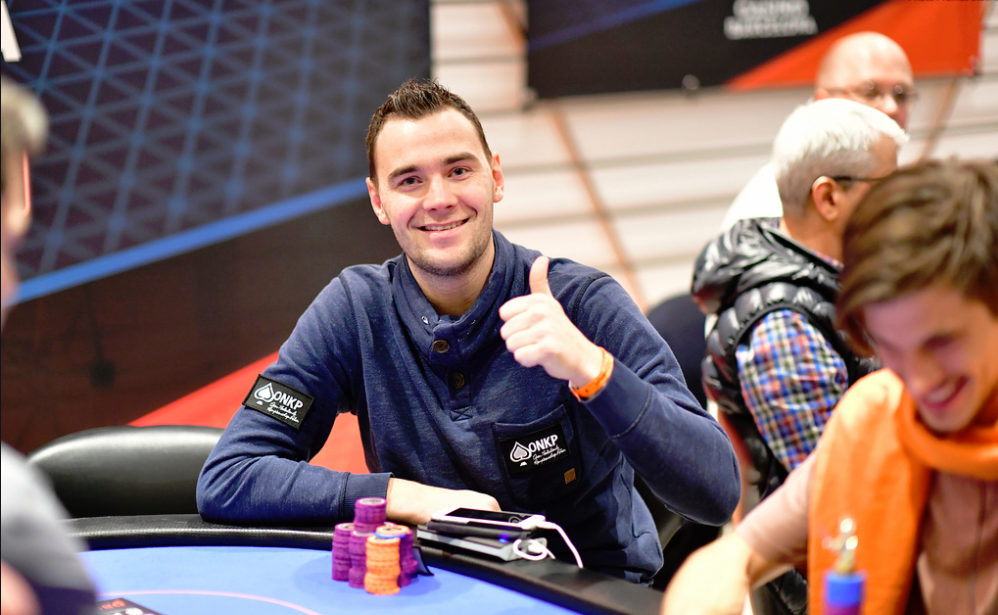 Mathijs heeft 1010 en zijn tegenstander heeft Ac 6c. Een aas op de river zorgt er voor dat Mathijs verliest en achterblijft met 450.000 punten (5,5 big blind).